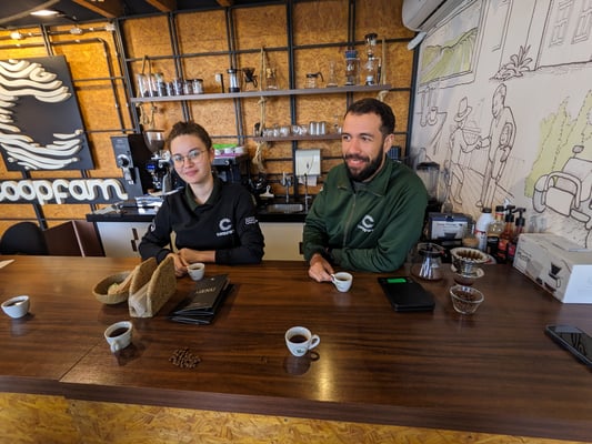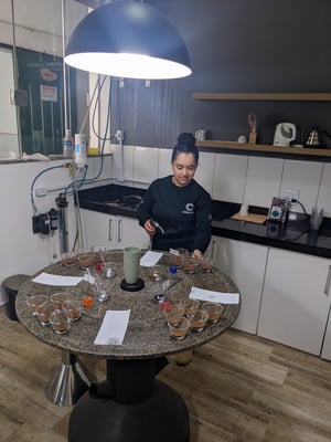 Wir cuppen vier Kaffees mit Marina und Emi und Eduardo vom Cupping Team. Zwei der aktuellen Safra und zwei vom letzten Jahr. Die aus dem letzten Jahr haben sich gut gehalten