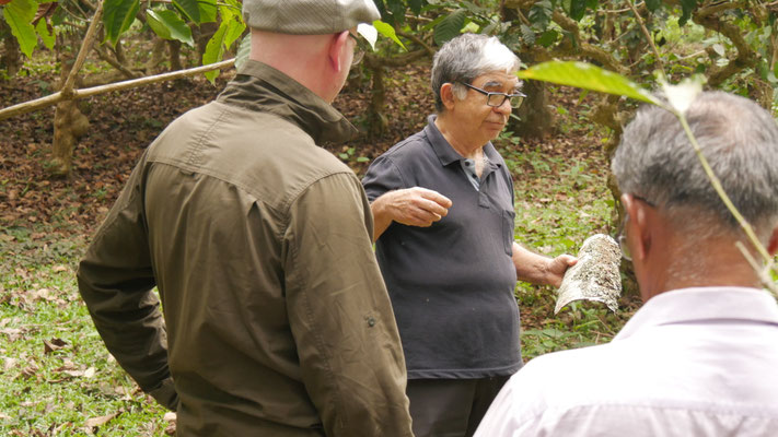 Selbstverständlich gab es auch einiges zum eigentlichen Grund unseres Besuches, dem Kaffee, zu entdecken und zu lernen. Zwischen den Kaffeepflanzen stehen große Bäume, meist auch Nutzpflanzen, also Obstbäume oder forstwirtschaftliche Arten wie Akazien, Mahagoni oder Teak. Kaffee ist ein Halbschattengewächs und braucht diese Pflanzen als natürliche Schattenspender. Da wir leider zu der langweiligsten Phase der Saison zu Besuch waren, gab es an den Kaffeepflanzen selbst wenig Spannendes zu begutachten - sie waren weder in der Blüte noch trugen sie rote Früchte. Arbeit gibt es auf den Farmen trotzdem immer und die Kaffeepflanzen brauchen das gesamte Jahr Aufmerksamkeit. Neben der richtigen Düngung ist vor allem das Zurückschneiden eine der wichtigsten Aufgaben. Würde man die Kaffeepflanze einfach ohne Pflege wachsen lassen, würde sie zu einem richtigen Baum heranwachsen, der Ertrag würde sinken und die Ernte durch die Wuchshöhe erschwert bzw. unmöglich. Bei den unterschiedlichen FarmerInnen konnten wir sehr gut sehen, was für einen Effekt eine penible Pflege haben kann. Während der eine Farmer mit einem sehr großen Gelände sich nicht so sehr die Mühe machte und sich die Pflanzen frei entfalten durften, war dessen Ertrag auf die Fläche gerechnet um das Vielfache niedriger als bei einem der Farmerin, die es liebte ihre Farm sehr strategisch und fast wissenschaftlich zu betreiben.