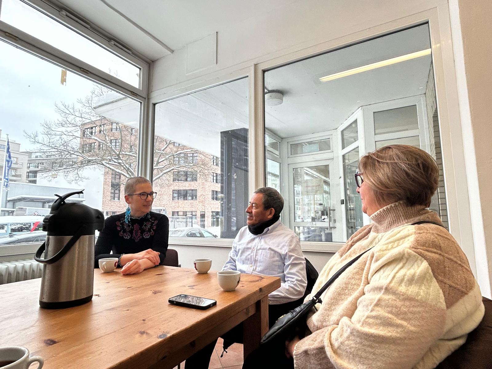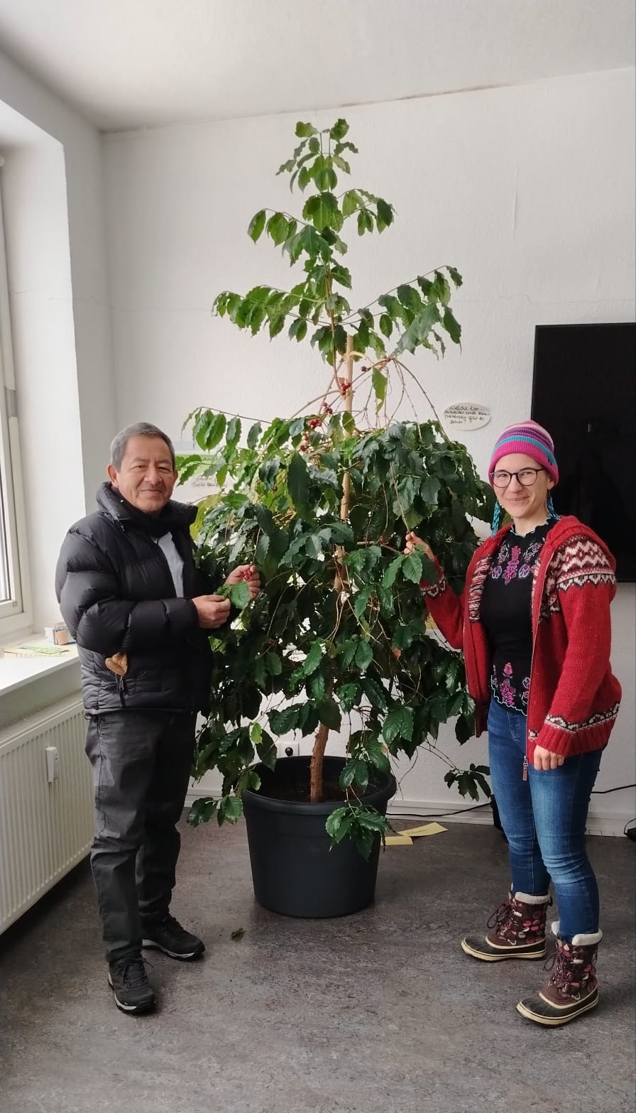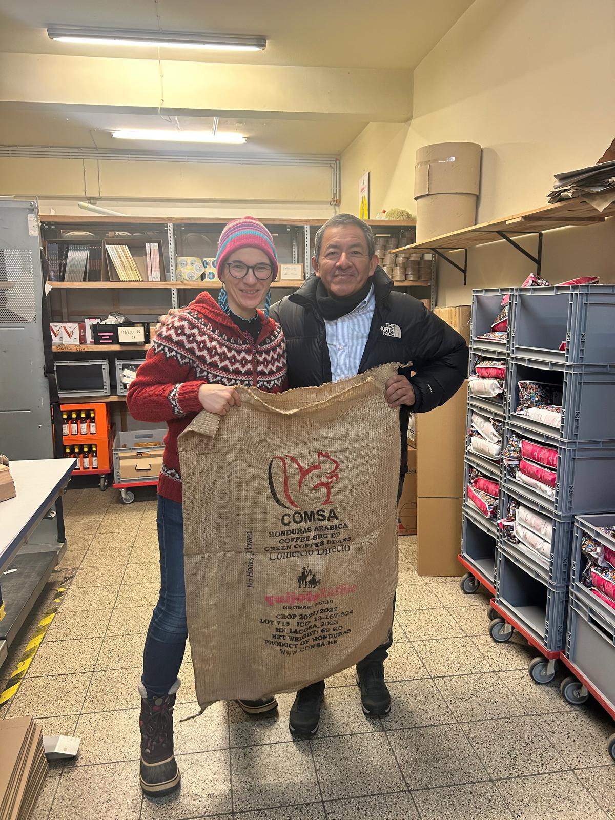 Am Samstag, dem 10. Januar haben wir uns dann in kleiner Runde bei Quijote getroffen. Nachdem der Parkplatz und kurze Weg zum Eingang zum Quijote-Büro mit einem großen Schneeschieber befreit war, konnten die Gäste parken und wohlbehalten eintreten. Aufgrund des am Ende überraschenden Besuches, entfiel zwar die umfangreich beabsichtigte Mittagstafel. Zu Kartoffelsuppe, frischem Brot und warmen Apfelkuchen hatten die Vorräte jedoch noch gereicht. Quijotes Büro, Küche und Gemeinschaftsräume gleichen in vielem eher einer Studenten-WG, die Produktions- und Lagerräume jedoch sind was sie sind: 100% Kaffeeproduktion. Es ist immer wieder schön, wenn nicht nur wir auf unseren Quijote Reisen Fincas sehen, sondern auch die Produzenten die Gelegenheit haben unsere Seite des Kaffeehandels und Rösterei kennen zu lernen. Don Dagoberto und seine Frau Mauren haben mit großem Interesse alles angesehen und viele Fragen gestellt: Rohkaffee-Silos, den Röster, die Verpackungsmaschine, unsere „Kaffee-Zubereitungs- und QC-Ecke“, unsere Packstationen für die Pakete für B2B und B2C, unseren Plenumsraum, unsere Büros, unseren Sample-Röstraum, unser Cupping-Labor und unsere hauseigene 14-jährige Kaffeepflanze „Herbie“. Da wir nur eine kleine Gruppe waren, haben wir im kleinsten Büro von Quijote zusammen gegessen, Kaffee getrunken und viel miteinander geredet. Bei Kaffee und Kuchen haben wir über Kaffeepreise, die schier absurde Volatilität des Kaffee-Weltmarktpreises in New York, die damit verbunden Risiken für Produzenten und Kooperativen gesprochen und wie wir die Perspektiven für den Kaffeemarkt sehen. Herausforderungen bei der Kaffee-Produktion. Tanz auf dem Seil im Kaffee-Handel. Seit der Gründung von Quijote bemühen wir uns, eine Alternative für den Umgang und die Kommunikation im Kaffeehandel zu leben, zu bewerben, zu verbreitern und Veränderungen zu bewirken. Im Kleinen sehen wir auch deutliche Erfolge davon, die enge Beziehung, offener Austausch mit Produzenten, gute Rohkaffee-Qualität sind Motivation für uns. Im Großen jedoch sind kaum Änderungen zu sehen. Alle damaligen Herausforderungen im Vergleich zum Zeitpunkt der Gründung Quijotes haben sich gefühlt nur noch gesteigert. Diese Herausforderungen strukturiert aufzuzeigen ist oft schwierig und gleichzeitig so wichtig. Deshalb sind wir bei dem Besuch so verblieben, dass Don Dagoberto nach seiner Rückkehr nach Honduras mir per Whatsapp eine Sprachnachricht schickt um seine ganz persönliche, aktuelle Sicht bzgl. Herausforderungen in konkrete Worte zu fassen. Beim Besuch bei Quijote gab es zu viel Neues, Aktuelles und „fliegende Themenwechsel“ was besprochen werden wollte und sollte. Sprachnachrichten sind unserer Erfahrung nach eine guter Weg, um längere Inhalte zu kommunizieren. Mittlerweile gibt es auch gute technische Unterstützung für eine Transkription